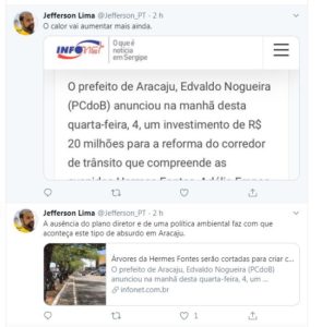 Presidente do PT de Aracaju , Jefferson Lima critica projeto de Edvaldo que retira árvores da Avenida Hermes Fontes Do presidente do PT/AJU pelo twitter: “O calor vai aumentar mais ainda. A ausência do plano diretor e de uma política ambiental faz com que aconteça este tipo de absurdo em Aracaju. A preocupação com o aquecimento global aumenta todo ano. A administração pública precisa se preocupar em diminuir as ilhas de calor dos centros urbanos, com a criação, ampliação e manutenção dos espaços verdes. É um erro insistir nas derrubadas de árvores. A desumanização da cidade. Uma cidade inteligente precisa cuidar das pessoas e do meio ambiente.”