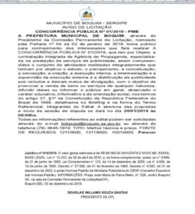 Boquim: concorrência para contratar agência de propaganda A Prefeitura de Boquim publicou a concorrência pública 01/2019 que tem como objetivo a contratação integrada de agência de propaganda, especializada na prestação de serviços de publicidade. A abertura das propostas será no dia 20 de janeiro às 8h. Todas as informações podem solicitadas através do e-mail: licitação@boquim.se.gov.br ou através do telefone (79) 3645 – 1919. Ver print ao lado.