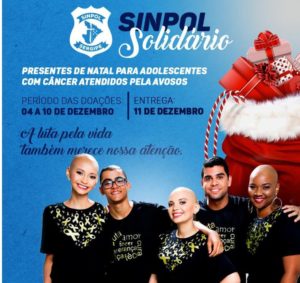Sinpol/SE inicia campanha para doar presentes a adolescentes com câncer atendidos pela Avosos Arrecadar presentes para 82 adolescentes atendidos pela Associação dos Voluntários a Serviço da Oncologia em Sergipe. Essa é a meta do Sindicato dos Policiais Civis do Estado de Sergipe (Sinpol/SE) até a próxima quarta-feira, 11, quando os jovens participarão da festa natalina da Avosos e receberão todos os presentes doados durante o evento. Qualquer pessoa pode doar presente para a campanha Sinpol Solidário que é voltada para 42 garotas e 40 garotos.