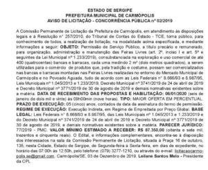 concorrência pública 02/2019, para permissão de serviço público, a título precário e remunerado, para organização, administração e manutenção das feiras livres no município (print ao lado). A abertura das propostas será no dia 06 de janeiro. Mais informações: (79) 3277- 1210 e pelo e-mail: licitacaocarmopolis.se@gmail.com