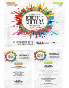 Promoção Cultural da OAB/SE promoverá o I Seminário de Direito e Cultura: uma abordagem transdisciplinar. Com nomes importantes do direito e da cultura, o evento objetiva fomentar a discussão, o estudo e a pesquisa sobre os direitos culturais, bem como os instrumentos necessários para sua efetivação. O seminário é destinado a estudantes e profissionais da área jurídica, cultural e artística, gestores e produtores culturais de órgãos públicos e privados. As inscrições custam vinte reais e serão feitas através aqui.