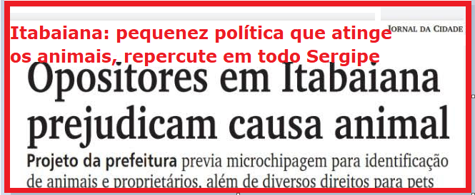 No fim de semana, o Jornal da Cidade foi feliz ao publicar uma matéria (ver print ao lado) mostrando o comportamento de parte dos vereadores de Itabaiana que rejeitaram um projeto encaminhado pelo prefeito, Valmir de Francisquinho, que tratava não apenas dos direitos dos animais, mas de saúde pública. Entre os benefícios, como destaca a matéria do JC, a microchipagem para identificação dos animais, a criação da figura do cuidador que receberia ajuda para comprar ração e a punição por maus tratos e abandonos. Ou seja, um projeto que já assiste em várias capitais do país e conectado com os dias atuais. O projeto teve o apoio e a ajuda da deputada estadual Kitty Lima, baluarte da luta em defesa dos animais em Sergipe.