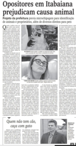 No fim de semana, o Jornal da Cidade foi feliz ao publicar uma matéria (ver print ao lado) mostrando o comportamento de parte dos vereadores de Itabaiana que rejeitaram um projeto encaminhado pelo prefeito, Valmir de Francisquinho, que tratava não apenas dos direitos dos animais, mas de saúde pública. Entre os benefícios, como destaca a matéria do JC, a microchipagem para identificação dos animais, a criação da figura do cuidador que receberia ajuda para comprar ração e a punição por maus tratos e abandonos. Ou seja, um projeto que já assiste em várias capitais do país e conectado com os dias atuais. O projeto teve o apoio e a ajuda da deputada estadual Kitty Lima, baluarte da luta em defesa dos animais em Sergipe.