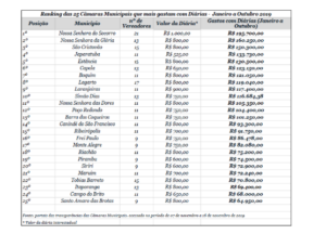 Janeiro a outubro De janeiro a outubro de 2019, foram gastos cerca de R$ 3.971.692,38 em pagamentos de diárias por parte de todas as Câmaras Municipais do estado de Sergipe. Contudo, segundo o movimento, esse valor pode ser maior dado que algumas Câmaras Municipais não estão com seus portais da transparência atualizados.