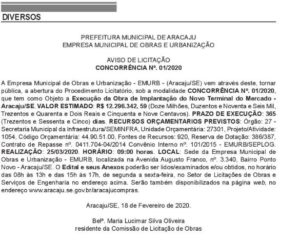 Enfim saiu edital para execução e implantação do novo terminal do Mercado de Aracaju E foi publicado ontem, 20, no Diário Oficial do Estado, o edital para a licitação 01/2020 da Prefeitura de Aracaju, através da Emurb, com o objetivo de execução da obra e implantação do Novo terminal do mercado de Aracaju. O prazo de execução é de um ano e a obra está orçada em cerca de R$ 12,2 milhões. Mais detalhes: www.aracaju.se.gov.br/aracajucompras