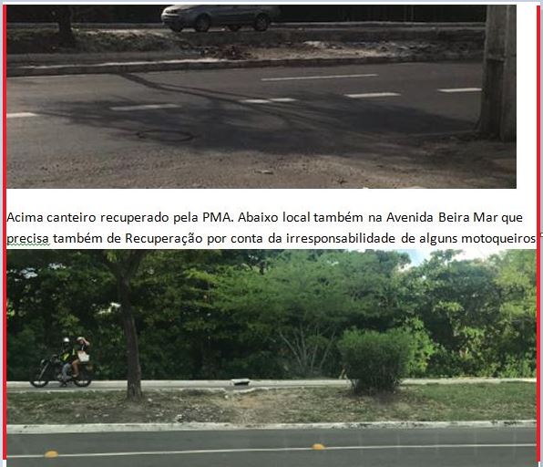 Avenida Beira Mar: é preciso reparar os locais do canteiros onde motoqueiros insistem em cometer irregularidades Recentemente a Prefeitura de Aracaju, através da SMTT ou Emurb, recolocou paralelepípedos em retorno que estava interditado há vários anos quase em frente ao Empório Bento na Avenida Beira Mar onde motoqueiros insistiam em usá-lo (primeira foto acima). A segunda foto é de uma uma abertura feito no canteiro na curva após o Palácio na Rua da Praça Alcebiades Paes que vai para a Beira Mar ao lado da pizzaria Forneria Napoletana, onde os motoqueiros insistem em atravessar numa curva. Por várias vezes os motoristas têm que frearem bruscamente para não baterem em motoqueiros Irresponsáveis que atravessam o canteiro pela abertura aberta por eles. É só a PMA mandar levantar ou implantar novamente os paralelepípedos com a arborização.