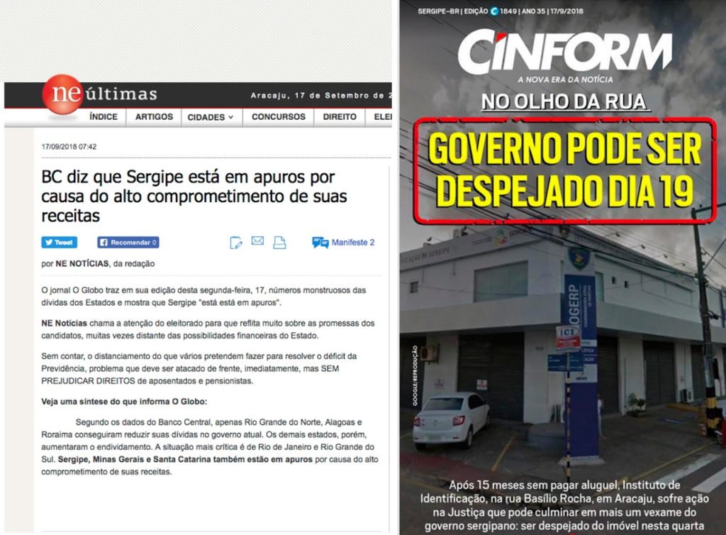 Matéria do jornal O Globo de ontem, 17, destacada pelo NE Notícias, comprovou a situação vexatória de Sergipe que será deixada pelos governos Jackson/Belivaldo/Jackson. O jornal mostrou números monstruosos das dívidas dos Estados e mostra que Sergipe “está em apuros.” O NE Notícias chamou a atenção do eleitorado para que reflita muito sobre as promessas dos candidatos, muitas vezes distante das possibilidades financeiras do Estado.
