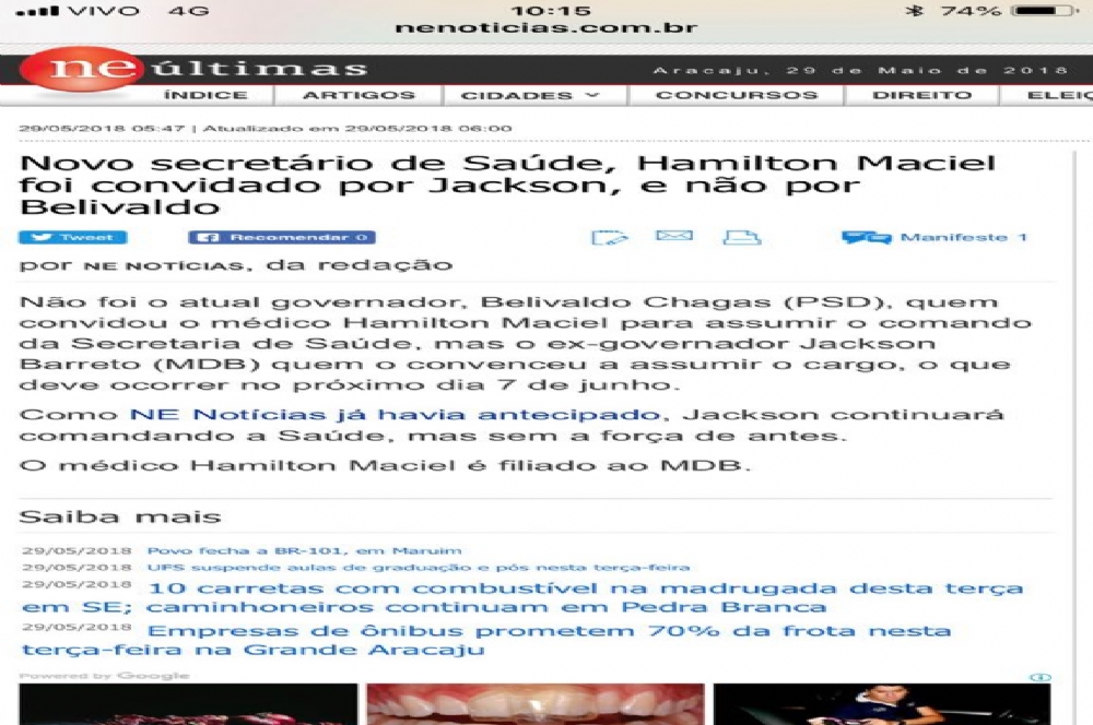 buscando coragem para demitir Almeida Lima da saúde e mais um mês com um secretário interino. Anunciou agora o nome do médico Hamilton Maciel que assumirá na semana passada, que foi uma escolha pessoal de Jackson Barreto. O blog já tinha cantado a pedra há duas semanas, inclusive tem testemunhas: pessoas da família de Hamilton que sabem que Jackson foi à residência dele.