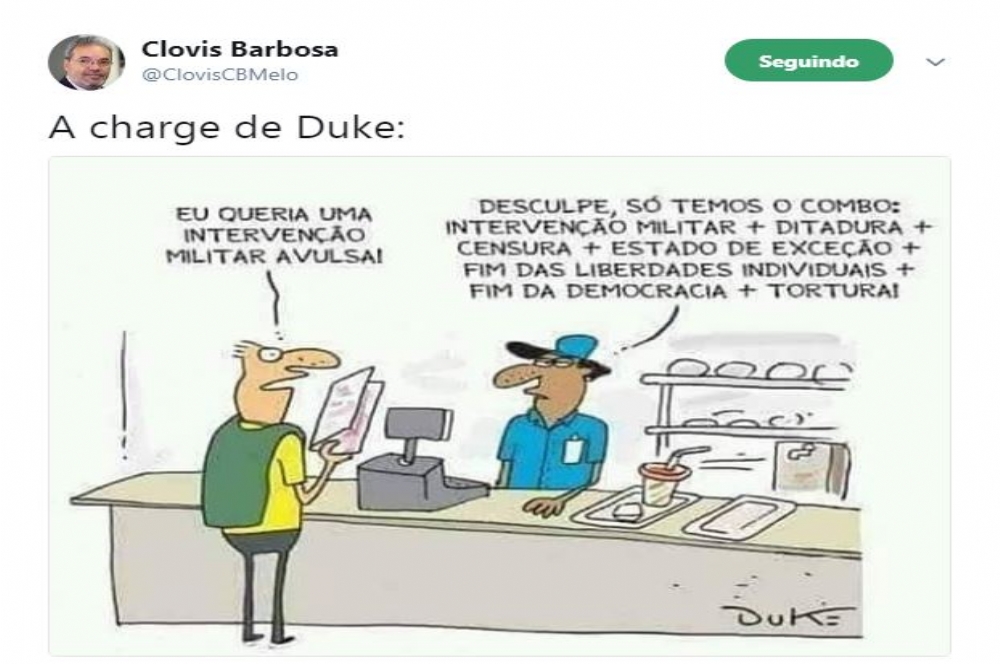 Twitter.com/jrobertotgomes A ideia de uma intervenção militar que subverta o estado democrático de direito estabelecido na CF insulta aos próprios militares, os quais juraram defender à pátria, suas leis e Constituição com o sacrifício da própria vida, e nunca ao arbítrio dos loucos e ou inconsequentes…