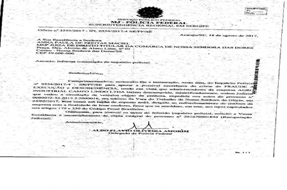 Agro Industrial Campo Lindo: PF está investigando fraude a execucação e desobediência A Policia Federal abriu inquérito policial e encaminhou para a juíza da Comarca de Nossa Senhora das Dores, ofício informando da abertura do IP para apurar a possível fraude a execucação e desobediência, tendo em vista que administradores da Agro Industrial Campo Lindo Ltda, teriam descumprido, ordem judicial que veda a circulação de veículos objeto de penhora nos autos do processo que tramita na Vara do Trabalho de Nossa Senhora da Glória.