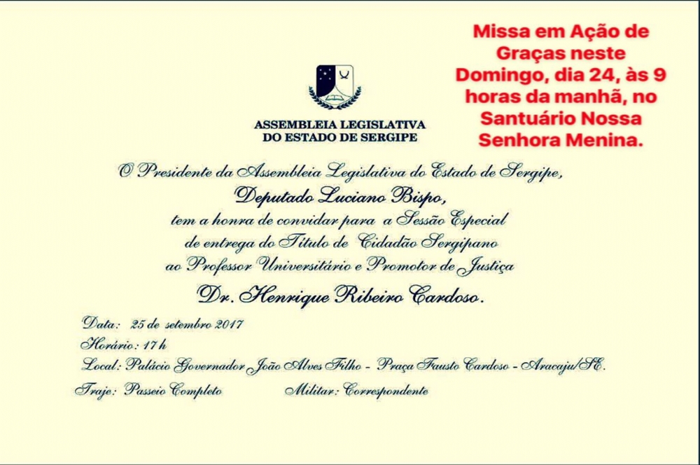 | Segunda 25, o promotor Henrique Cardoso receberá título de cidadania sergipana. Antes, no domingo, 24, será realizada uma missa às 9h, no Santuário Nossa Senhora Menina. |