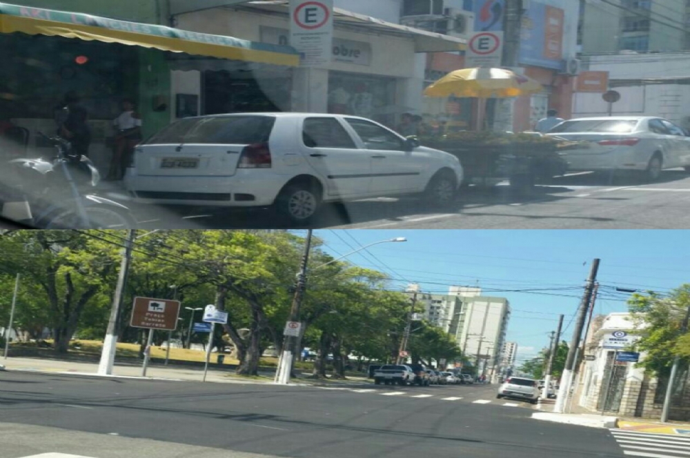 | Em cima negligência da SMTT com banca de frutas em vaga de idoso na Rua São Cristovão. Abaixo o medo da SMTT em multar em frente a SSP apesar das duas placas de proibido estacionar. |