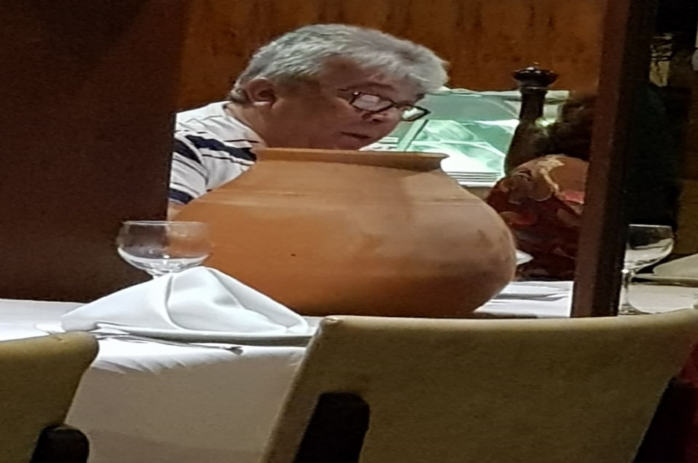 | O responsável pelo caos na saúde estadual, Almeida lima no fim de semana na Cantina Ferreiro. Não é que o pote na foto caiu bem para a situação de Jackson? |