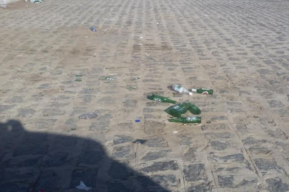 | Garrafas quebradas é uma constante no estacionamento da Passarela do Caranguejo. |