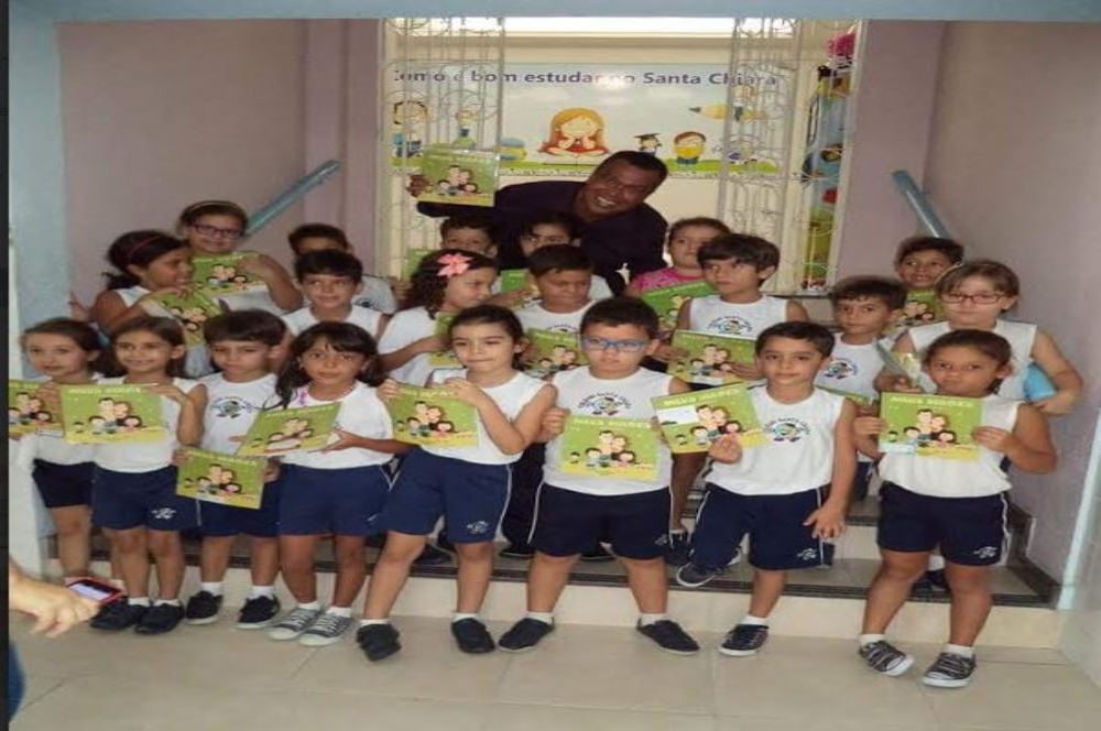 | O escritor rodeado de crianças de uma das escolas que adotou o livro. (Foto/Divulgação) |