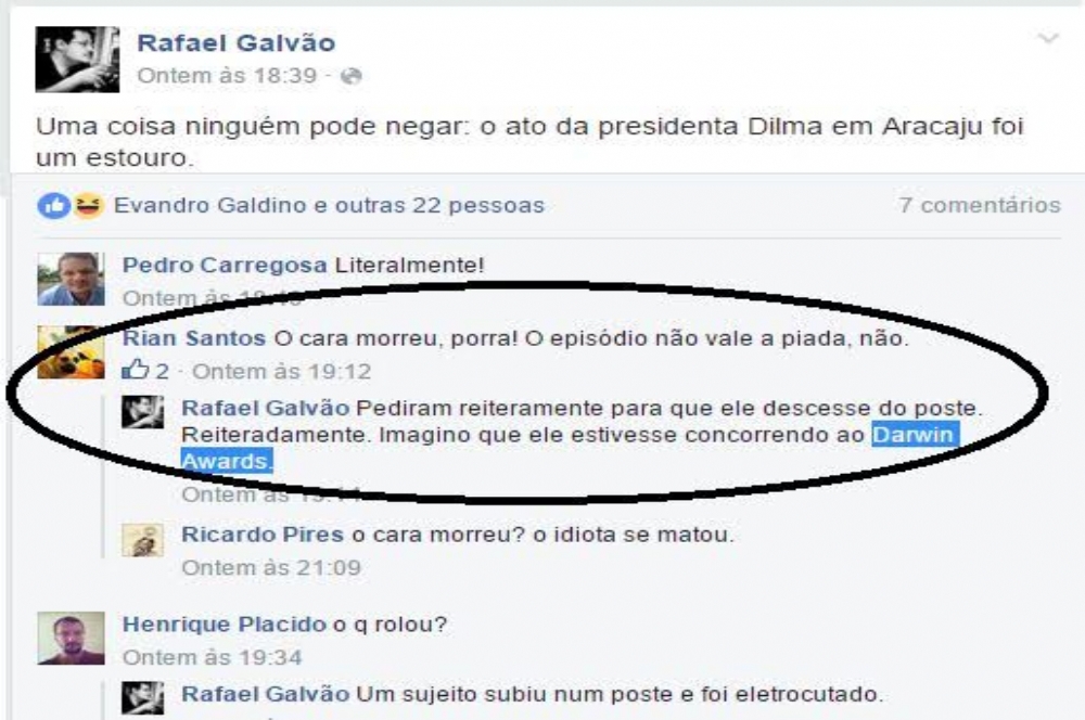 marketing do ex-prefeito foi infeliz numa postagem no facebook ao escrever sobre a morte do flanelinha eletrocutado no ato de Dilma. Fez uma piada extremamente grosseira e cruel com a morte ocorrida lá. Postou: “Uma coisa ninguém pode negar: o ato da presidenta Dilma em Aracaju foi um estouro”. Ele zombou da morte trágica de um ser humano. O jornalista Rian Santos chegou a adverti-lo da infelicidade da piada.