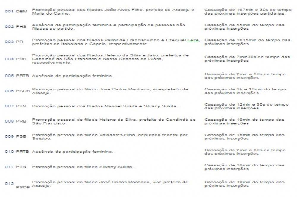 A Procuradoria Regional Eleitoral em Sergipe detectou irregularidades nas propagandas partidárias de oito partidos políticos do Estado. Entre elas estão a promoção pessoal de filiados e ausência de participação feminina. Os fatos deram origem a 12 representações eleitorais. Como penalidade, a PRE/SE pediu ao Tribunal Regional Eleitoral para cassar das agremiações, nas futuras propagandas partidárias, o tempo equivalente a cinco vezes ao da inserção ilícita, conforme estabelece a lei eleitoral.