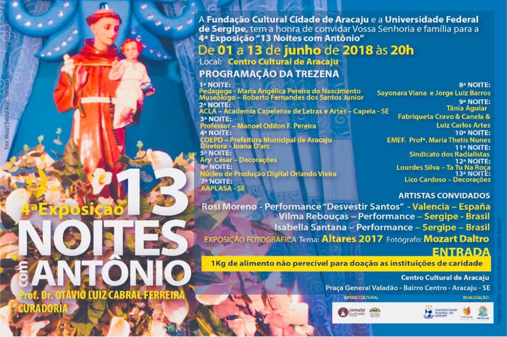 4ª Exposição 13 Noites com Antônio A Fundação Cultural Cidade de Aracaju e a Universidade Federal de Sergipe, tem a honra de convidar os sergipanos para a 4ª Exposição “13 Noites com Antônio”De 01 a 13 de junho de 2018 às 20h.Local: Centro Cultural de Aracaju. Veja programação no print.