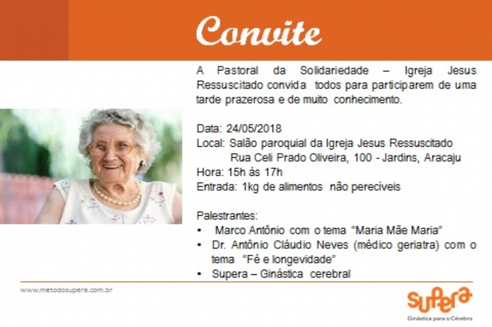 | Dr. Antônio Cláudio Neves – geriatra falará sobre FÉ e longevidade. Será um bom momento de reflexão. Hoje, 24, a partir das 15h, no Salão Paroquial da Igreja Jesus Ressuscitado em Aracaju. |