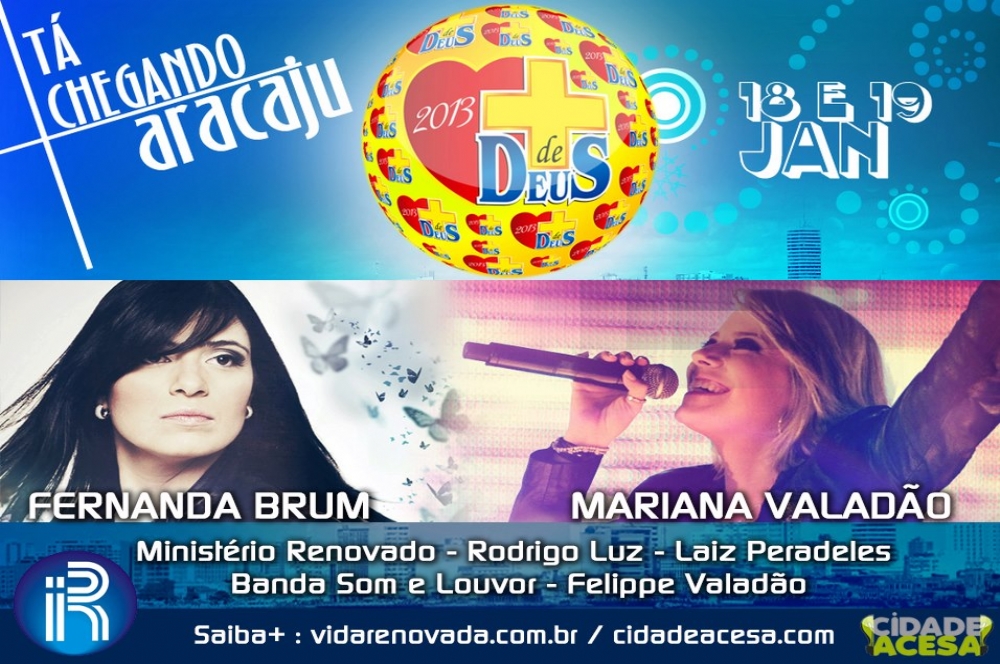 Mais de Deus está na sua 12ª edição e é um dos eventos mais esperados pela comunidade evangélica do Estado. Como todos os anos, o evento acontece nos dias do Pré-Caju e em 2013 será entre os dias 18 e 19 de janeiro. As atrações confirmadas pelos organizadores são: Banda Som e Louvor, Felippe e Mariana Valadão e Fernanda Brum. Agende aí!