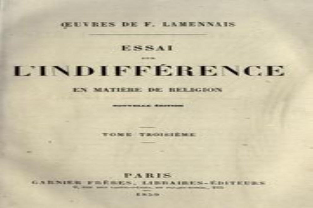 No seu ensaio sobre a indiferença religiosa, Lamennais contemplava um século doente, não porque estivesse apaixonado pelo erro, mas porque era “um tempo que negligenciava a verdade do bem e do mal, a árvore que dava a vida e aquela que promovia a morte, árvores alimentadas pelo mesmo solo, cruzando no meio dos povos que sem levantar a cabeça, passam, estendem a mão e agarram seus frutos ao acaso”.