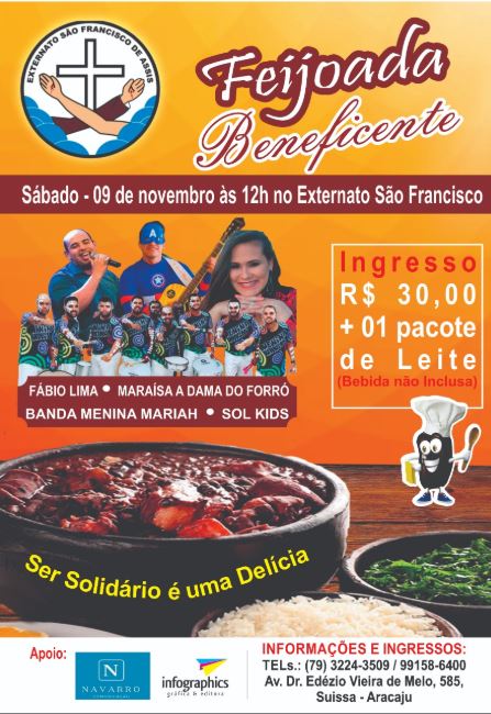 Grandes atrações vão agitar a Feijoada do Externato São Francisco O Externado São Francisco de Assis vai realizar a tradicional ‘Feijoada Beneficente’ a partir das 12h do sábado, dia 9 de novembro, na sede da instituição, localizada na Avenida Edézio Vieira de Melo, número 585, Bairro Suíssa, em Aracaju. A festa será comandada por Thiago Sol, com a banda Sol Kids, Fábio Lima, Maraísa a Dama do Forró e manda Menina Mariah.