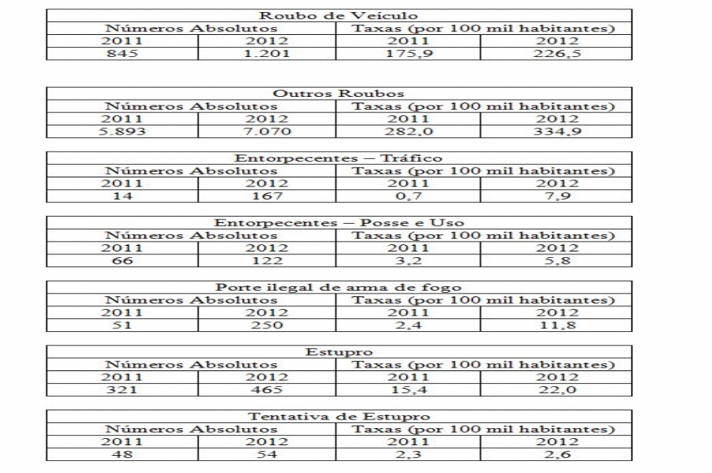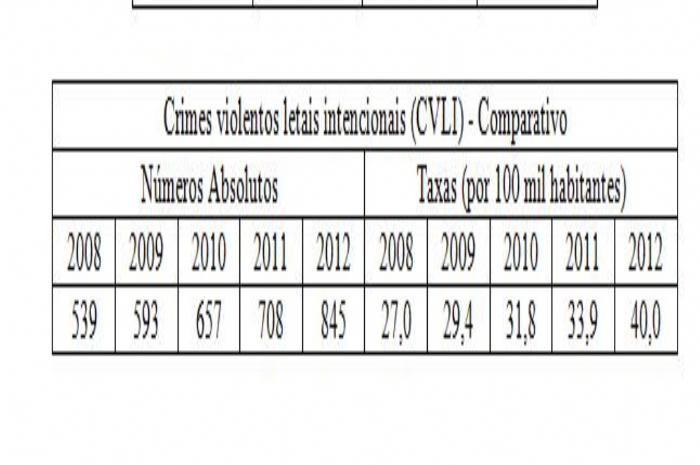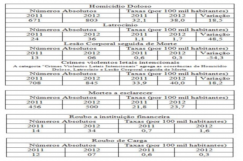 A taxa de homicídios dolosos no país cresceu 7,8% entre 2011 e 2012 e atingiu 24,3/100.000 habitantes. Entre aquelas UFs com boa qualidade dos dados criminais, apresentaram maior crescimento dos homicídios os estados do Ceará (32%), Goiás (28,4%), Acre (24,2%)e Sergipe (18,5%). Reduziram seus homicídios: Rio de Janeiro (5,6%) e Pernambuco 6,5%). Alagoas continua sendo o estado com a maior taxa de homicídios do país, mas conseguiu reduzi-la 21,9%, de 2011 para 2012; contudo, viu os latrocínios crescerem 140% no mesmo período. As mortes por arma de fogo representaram, em 2011, 70,4% dos homicídios.
