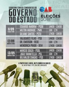 OAB ouvirá candidatos ao governo De hoje, 11, a 13 de setembro, a Ordem dos Advogados do Brasil, em Sergipe, realizará uma sabatina com os candidatos ao cargo de governador do Estado. O objetivo da OAB é promover a apresentação das propostas de governo para