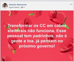 www.twitter.com/AntonioSamaroneTransformar os CC em cabos eleitorais não funciona. Esse pessoal tem padrinhos, não é gente a toa. já pensam no próximo governo!
