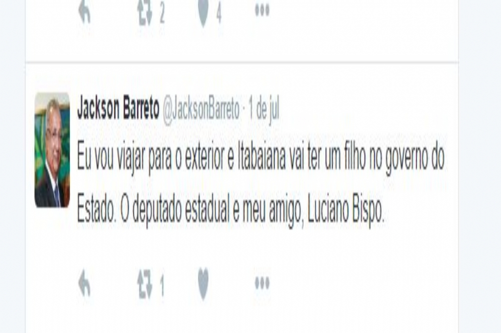 Enfim um ato de lucidez do deputado estadual Luciano Bispo.Embora o governador Jackson Barreto tenha anunciado pelo twitter que o parlamentar assumiria o governo durante alguns dias das férias dele (15 dias), por conta do desgaste atual e a indefinição do mandato, Luciano procurou o secretário João Gama e disse que agradecia o gesto, mas não deseja assumir.