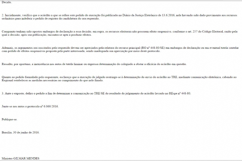 No dia 30 de Julho, Gilmar Mendes, mandou notificar TRE/SE sobre decisão contra Luciano. Não tem efeito suspensivo.