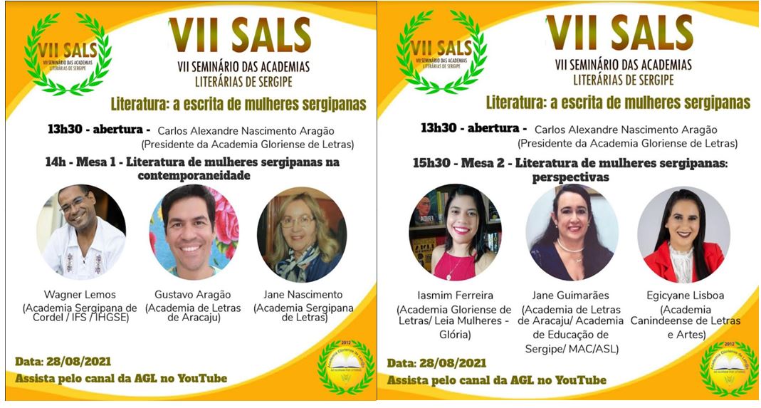 A Academia Gloriense de Letras (AGL), neste sábado, 28/08/21, às 13h30, via sala virtual no Google Meet, com transmissão pelo canal da Academia no YouTube https://www.youtube.com/c/AcademiaGloriensedeLetras/featured , realizará o VII Seminário das Academias Literárias de Sergipe (SALS), O tema desta edição será “Literatura: a escrita de mulheres sergipanas”.