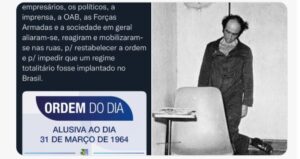 www.twitter.com/gdoweber Todo ano é assim: uns abjetos elogiam o vergonhoso período da ditadura militar, pra, logo após, pipocar notas de repúdio oficias e tuítes raivosos. Não cansam não? PS: o discurso que ditadura militar iniciou-se dia 31/03 é dos militares pra escapar do dia 1°/04, dia da mentira.