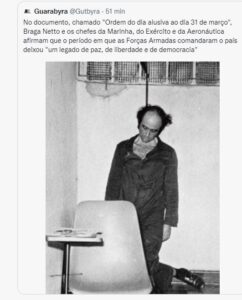 www.twitter.com/andrizek À esquerda, a falta de vergonha – em vez de reconhecer o nefasto capítulo e pedir desculpas aos brasileiros por anos de ditadura, assassinatos, tortura e censura. À direita, a prova da “bravura”: mataram o jornalista Vladimir Herzog e, covardes, tentaram forjar que foi suicídio.