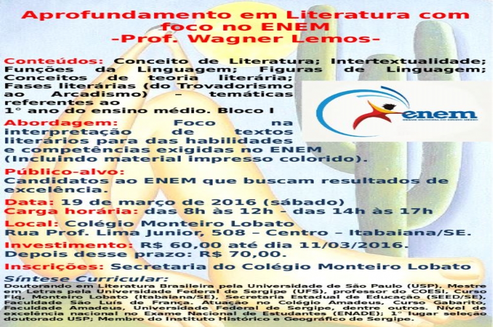 Itabaiana (Centro), um curso sobre aprofundamento em literatura com foco no ENEM. Será nos dois turnos (8h às 12h – 14h às 17h), tendo como abordagem o foco na interpretação de textos literários para as habilidades e competências exigidas pelo ENEM.