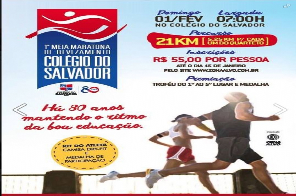 A 1ª Meia Maratona de Revezamento do Colégio Salvador será realizada no domingo, dia 01 de fevereiro de 2015. A largada da