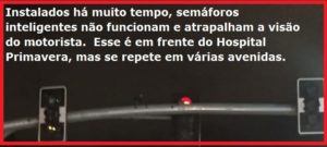 funcionar os famosos semáforos inteligentes? Estão esperando 2020, que por “coincidência” é ano eleitoral? O certo é que nas principais avenidas estão instalados e não funcionam, pelo contrário atrapalham os motoristas porque em alguns locais – como o da foto ao lado do Hospital Primavera – o da frente, que não funciona atrapalha a visão do que está atrás, que está ligado. Até quando SMTT?