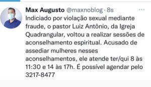 Após ser absolvido pela Justiça, o pastor Luiz Antônio, da Igreja Quadrangular, já está realizando sessões de aconselhamento espiritual Deu no Blog do Max Augusto: “Após ser absolvido pela Justiça, o pastor Luiz Antônio, da Igreja Quadrangular, já está realizando sessões de aconselhamento espiritual. Indiciado pela polícia por violação sexual mediante fraude, o pastor foi acusado por mulheres de assediá-las durante esses aconselhamentos. Ele foi absolvido porque alguns crimes foram considerados prescritos. Em outros casos, a Justiça considerou que houve sexo consensual com as denunciantes.” É Sergipe Del Rey… O instagram do Max: https://www.instagram.com/maxnoblog/