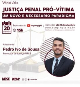 “Justiça Penal Pró-Vítima” Tema de Webinário hoje, 20, do MPE O Ministério Público de Sergipe, por meio da Escola Superior (ESMP), promoverá hoje, 20, a partir das 15h, Webinário com o tema “Justiça Penal Pró-Vítima: Um novo e necessário paradigma”. O evento é especialmente destinado aos membros e servidores do MPSE, mas aberto também à participação de todos os interessados. A transmissão será feita por meio do canal do MPSE no YouTube.