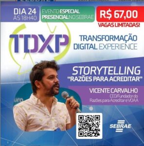 Transformação Digital é Acreditar Sempre! Inscreva-se nessa experiência híbrida especial. Venha participar da palestra do fundador do Razões Para Acreditar, Vicente Carvalho. Vai ser dia 24/11, às 18h40, dentro da programação do TDXP’2020. https://bit.ly/RazoesParaAcreditarSebrae Garanta já a sua vaga! TDXP – Transformação Digital Experience.