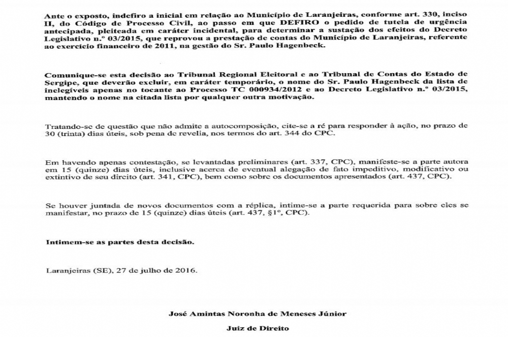 José Amintas Júnior concedeu tutela de urgência antecipada, suspendendo o decreto legislativo que rejeitou as contas dele da Prefeitura de Laranjeiras do ano 2001. Com a decisão, o juiz pede que comunique o TCE e o TRE para que o nome do prefeito eleito saia da lista dos inelegíveis. A decisão foi de ontem, 27.