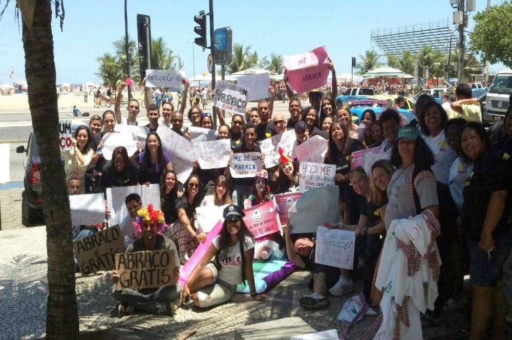 Eles seguravam cartazes que diziam: “Abraço Grátis”, “Me dê um abraço? Jesus te ama” e vestiam camisestas com a frase: “"Deus te ama tanto que deu o Seu único filho para te salvar." “Estamos distribuindo abraços grátis e dizendo que Jesus ama a todos”, disse Thiago, segundo o Jornal da Cidade.