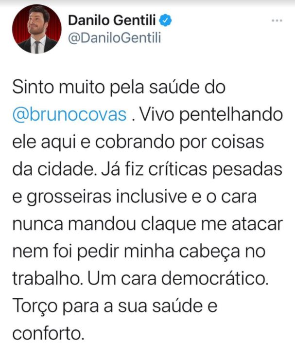 www.twitter.com/DaniloGentili Sinto muito pela saúde do @brunocovas . Vivo pentelhando ele aqui e cobrando por coisas da cidade. Já fiz críticas pesadas e grosseiras inclusive e o cara nunca mandou claque me atacar nem foi pedir minha cabeça no trabalho. Um cara democrático. Torço para a sua saúde e conforto.