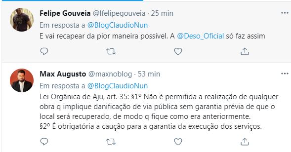 Aracaju: O governador e o prefeito são aliados, mas não se entendem. Há 15 dias a Prefeitura entregou a principal rua paralela à orla de Atalaia, a Niceu Dantas, totalmente recapeada. A estatal Deso chegou hoje esburacando. Pode isso? Cadê o MPE? Pode prefeito Edvaldo? E quando recapearem será uma tragédia! Leia no print as observações de um leitor e do jornalista Max Augusto pelo twitter.
