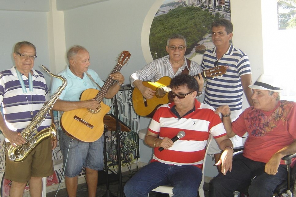 boa música, da música romântica. Realizado aos sábados a partir do meio dia, o encontro para amantes desse gênero de música tem conquistado muitos freqüentadores, pois o ambiente é convidativo e tem uma freqüência de pessoas seletas além de reunir a nata da musicalidade de Sergipe. Confira ao lado a foto histórica: Em pé: Medeiros, Gilberto, Djalma e Dio Campos. Sentados: Auvanildo e Roberto Alves.