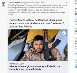Sergipano que “Arregou” na Ucrânia: se tivesse ido para uma missão humanitária seria Reverenciado e Sergipe teria orgulho, mas foi mais um vergonhoso desmiolado Repercutiu muito a postagem no twitter e no Instagram deste espaço a nota sobre o “arrego” do sergipano de Canhoba, de nome Gabriel, que foi para a guerra da Ucrânia pensando que era como se jogasse vídeo game.