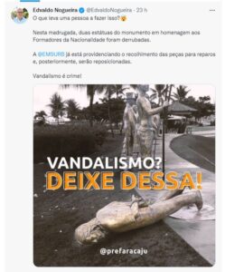 Vandalismo em estátua da orla após show autorizado pela própria PMA para apadrinhado sem nenhuma exigência. A Guarda Municipal estava onde? A Prefeitura de Aracaju que administra a orla há pouco tempo liberou geral. Autoriza shows de todos os tipos principalmente para os organizadores apadrinhados como é o caso de Teo Santana que organizou o Festival Trap. O show reuniu muita gente barra pesada e culminou com a depredação de muita coisa na orla inclusive a estátua de Tiradentes. Nas redes sociais o prefeito Edvaldo Nogueira condenou o vandalismo – o que o blog concorda que é preciso cadeia para esses marginais – mas lembra que a responsabilidade é da própria Prefeitura que vem autorizando shows de qualquer tipo sem exigir segurança e colocar a Guarda Municipal para trabalhar também. Se a Prefeitura não tiver critério para autorizar estes shows o vandalismo vai continuar…