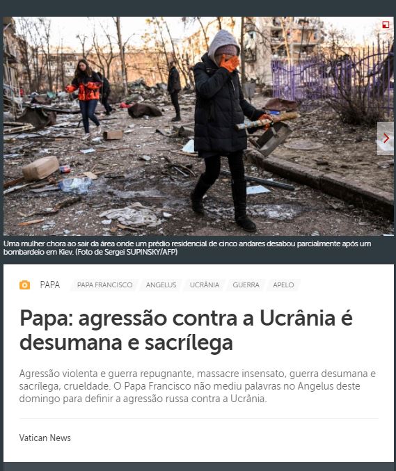 www.twitter.com/vaticannews_pt “A agressão violenta contra a #Ucrânia não para, um massacre insensato onde a cada dia se repetem destruição e atrocidades. Não há justificativa. Suplico a todos da comunidade internacional para que se empenhem realmente para pôr fim a esta guerra repugnante” #PapaFrancisco