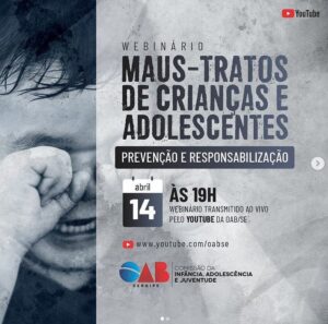 Amanhã, 14, webinário “Maus tratos de crianças e adolescentes” Nesta quarta-feira, 14, a partir das 19h, nossa Seccional abordará sobre maus tratos contra crianças e adolescentes através da Comissão da Criança, do Adolescente e do Jovem, inclusive com participação de psicóloga e assistente social para enriquecer o debate sobre a temática. O evento ocorre de forma totalmente online e gratuita com transmissão através do canal – www.youtube.com/oabse – participe!