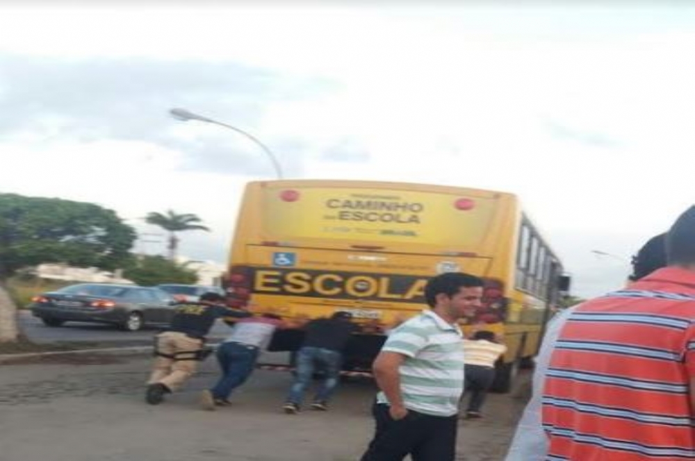 | Até a PRF ajudou a empurrar o ônibus da Prefeitura de Aparecida. |